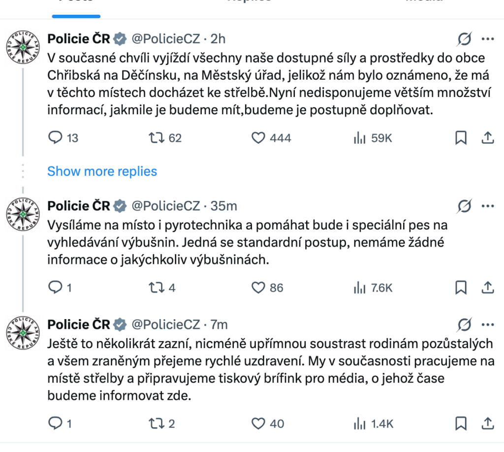 „Budova je bezpečná! V tuto chvíli můžeme potvrdit jednu zemřelou ženu a střelce. Počty zraněných budeme aktualizovat,“ uvedla policie ve svém oficiálním vyjádření na síti X.