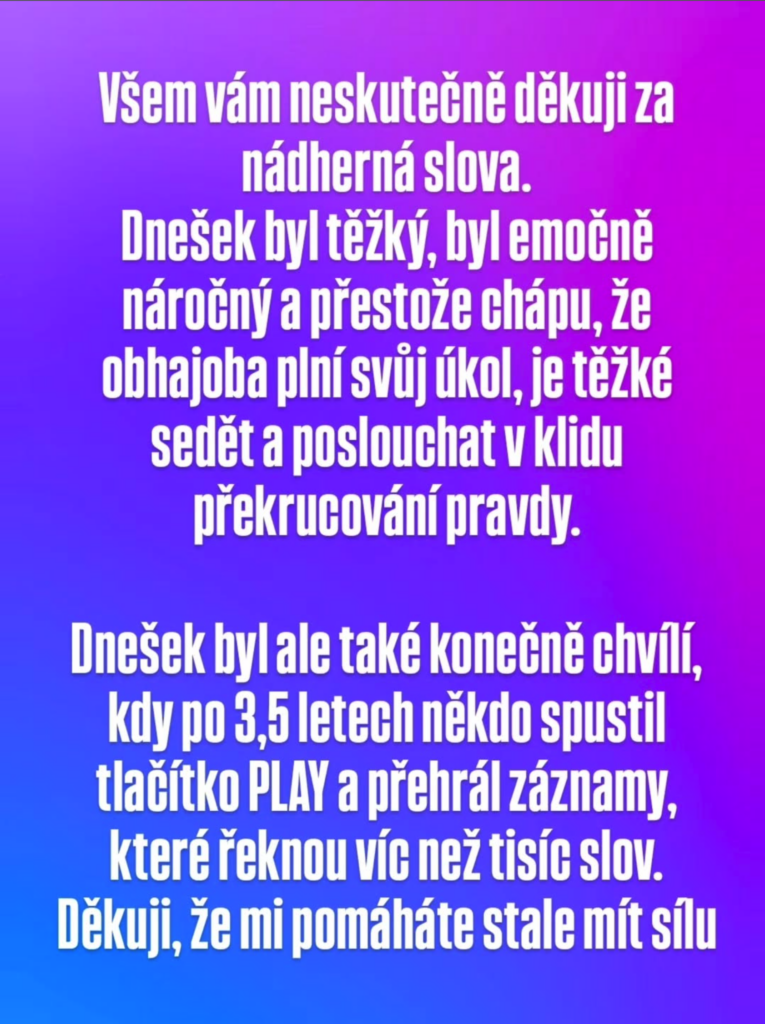 Podle informací ze soudní síně byly záběry natolik emotivní, že Nosková před jejich přehráním místnost opustila. Nechtěla znovu prožívat okamžiky, které podle svých slov patří k nejtěžším v jejím životě.