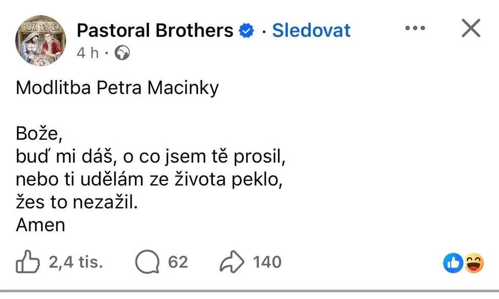Výsměch pokračoval. Populární Pastoral Brothers zveřejnili na síti X „modlitbu Petra Macinky“: