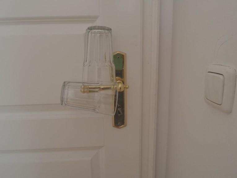 Nenechte se okrást – použijte sklenice i na dveře. Absurdní nápad může mít šťastný konec. Jednu sklenici zavěste na kliku dveří. Druhou sklenici položte na kliku nebo na zavěšenou sklenici.