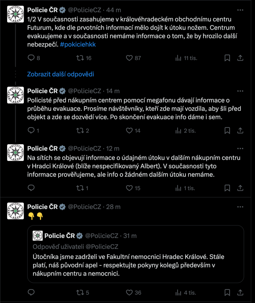 Policie i záchranné složky potvrdily, že žádné další nebezpečí veřejnosti aktuálně nehrozí. Vyšetřování okolností útoku pokračuje.