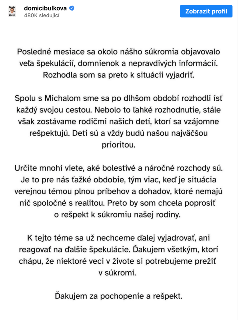 „Poslední měsíce se okolo našeho soukromí objevovalo mnoho spekulací, domněnek a nepravdivých informací. Spolu s Michalem jsme se po delším období rozhodli jít každý svou cestou. Nebylo to lehké rozhodnutí, stále však zůstáváme rodiči našich dětí, kteří se vzájemně respektují. Děti jsou a vždy budou naší největší prioritou,“ napsala Cibulková.