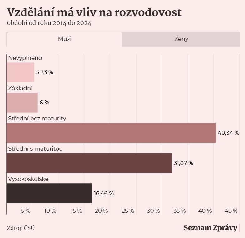 Mezi lidmi, kteří mají pouze základní vzdělání, se rozvedlo přibližně 50 % manželství. Tedy každý druhý pár. Naopak mezi vysokoškolsky vzdělanými manželi skončilo rozvodem pouze 23 % svazků. Rozdíl je tedy více než dvojnásobný, což podle odborníků není náhoda, ale odraz hlubších sociálních a ekonomických nerovností.