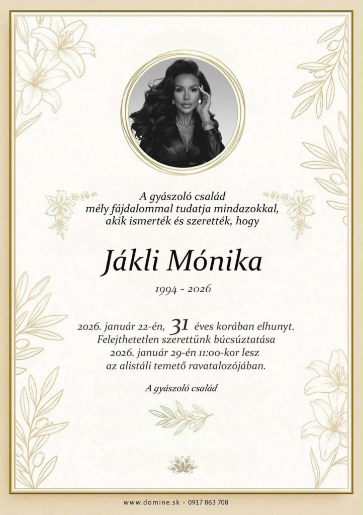 „S hlubokým zármutkem truchlící rodina oznamuje všem, kteří ji znali a milovali, že Mónika Jákli zemřela 22. ledna 2026 ve věku 31 let. Rozloučení s naší nezapomenutelnou milovanou se uskuteční 29. ledna 2026 v 11:00 hodin v pohřebním ústavu hřbitova v Alistálu. Truchlící rodina,“ stojí na parte.