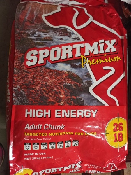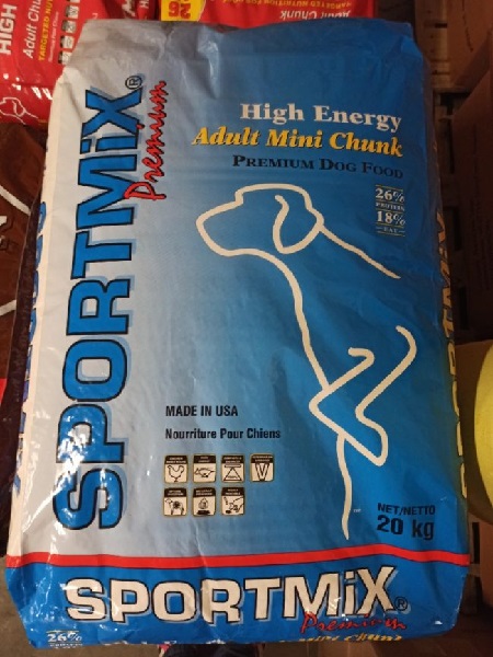 Druhým uvedeným typem je Sportmix High Energy á 20 kg. Tento produkt je inzerován jako vysoce energetické krmivo, vhodné pro velmi aktivní psy nebo zvířata v zátěži. Právě vyšší obsah kukuřice v těchto směsích může být v kombinaci s kontaminací aflatoxiny obzvlášť nebezpečný.