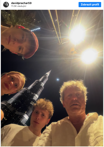 Na jedné z fotografií stojí Prachař se svými dětmi přímo pod monumentální siluetou Burdž Chalífy, nejvyšší budovy světa. Za nimi se tyčí její ikonická osvětlená fasáda, dominující nočnímu panoramatu města. Snímek působí jako klasická momentka z výjimečné dovolené – otec, děti, zážitek, na který se nezapomíná.