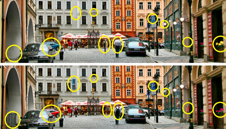 Obrázky jsou na první pohled téměř identické, ale při pečlivém zkoumání si lze všimnout, že některé detaily nesedí. Někde chybí část architektonického prvku, jinde je změněný tvar či barva, případně se liší počet oken nebo prvků na budově. Úkolem je najít přesně deset rozdílů, které jsou rozesety po celé scéně.