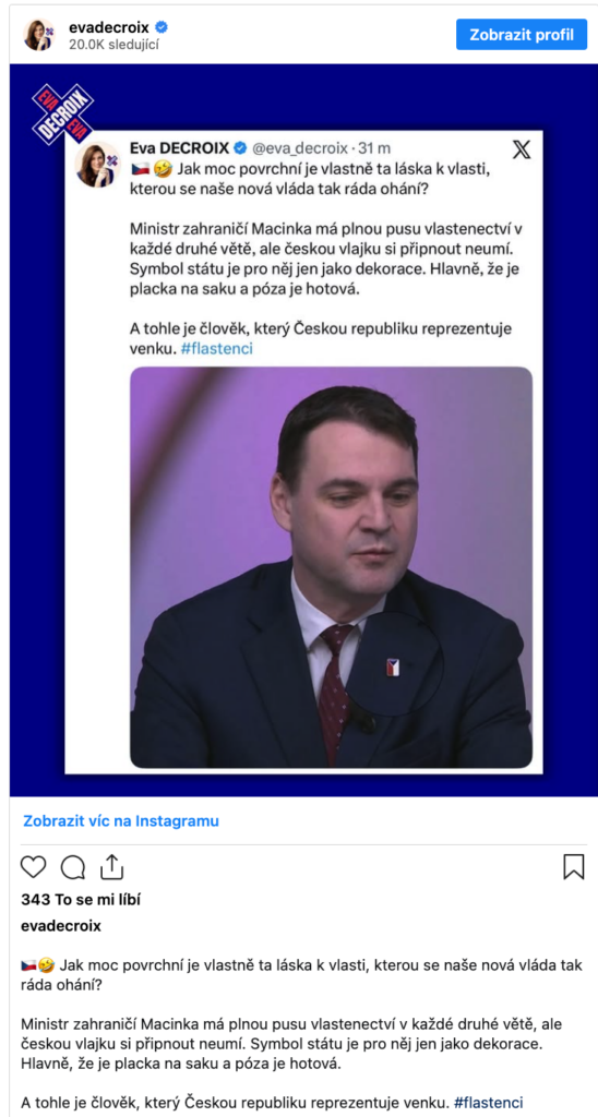 Zarazil ji způsob, jakým měl Macinka připnutý odznak české vlajky na klopě saka. Podle Decroix nešlo jen o technickou chybu, ale o symbolické selhání u člověka, který se navenek často hlásí k vlastenectví.