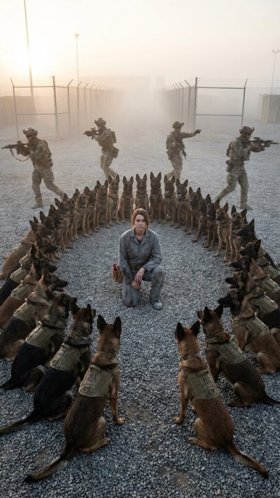 Všechna zvířata – připravená na válku, vycvičená k útoku – v jednu vteřinu ztuhla. Žádné štěkání. Žádná agrese. Jen absolutní, posvátné ticho. Sedli si do dokonalé řady a vytvořili kolem uklízečky neprostupnou hradbu. Ignorovali řev instruktorů i ostré povely svých psovodů. Jejich oči sledovaly jen ji.